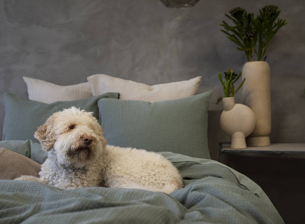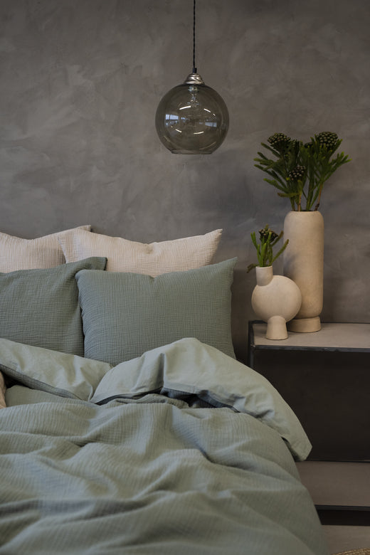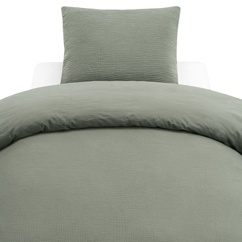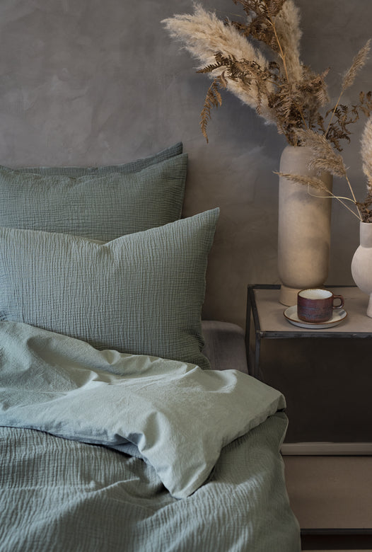 Påslakan och örngott med en krinklad framsida och slät baksida. Tillverkade i fin bomullspercale som känns svalt och skönt att sova i. Finns i olika färger.