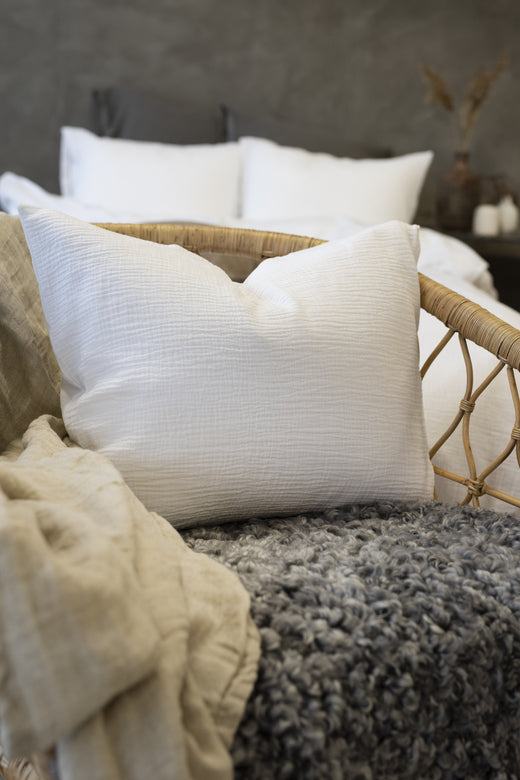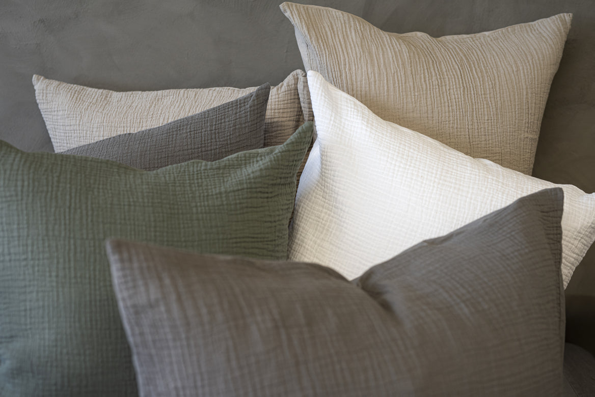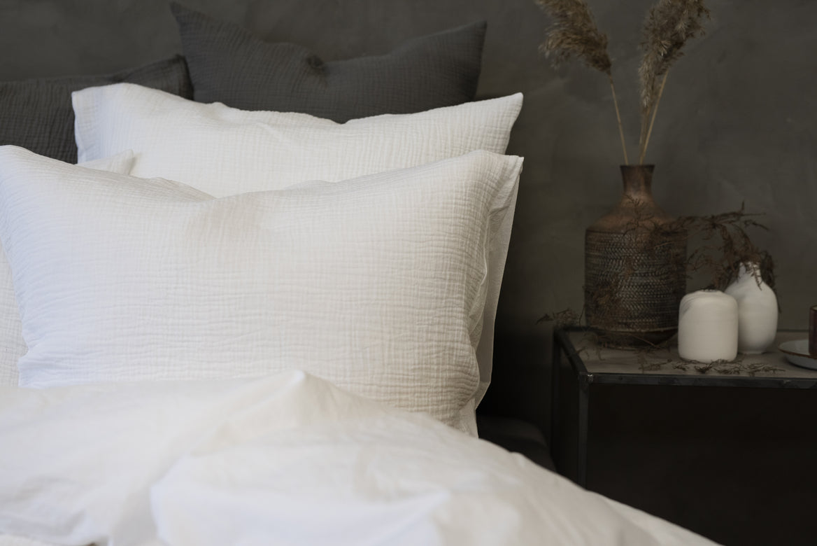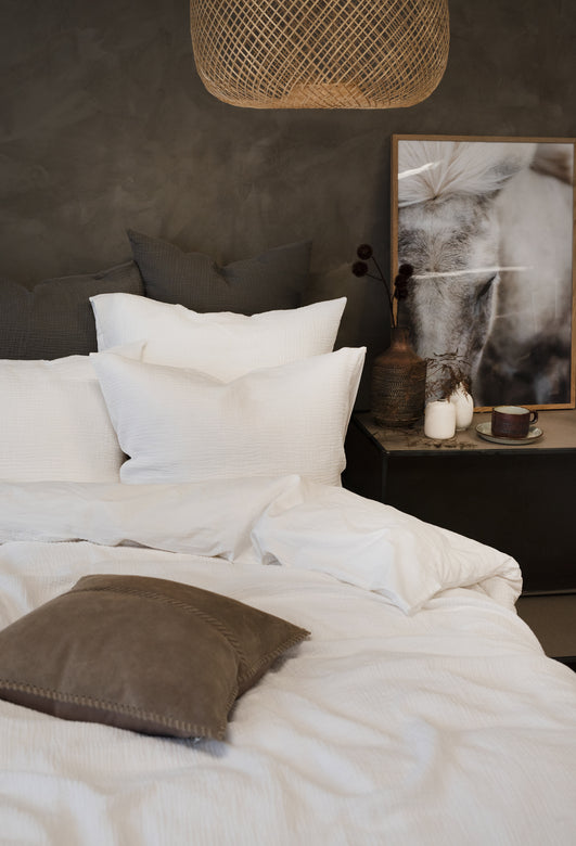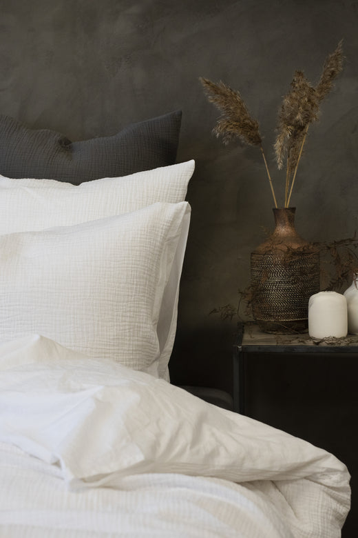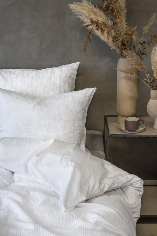 Påslakan och örngott med en krinklad framsida och slät baksida. Tillverkade i fin bomullspercale som känns svalt och skönt att sova i. Finns i olika färger.