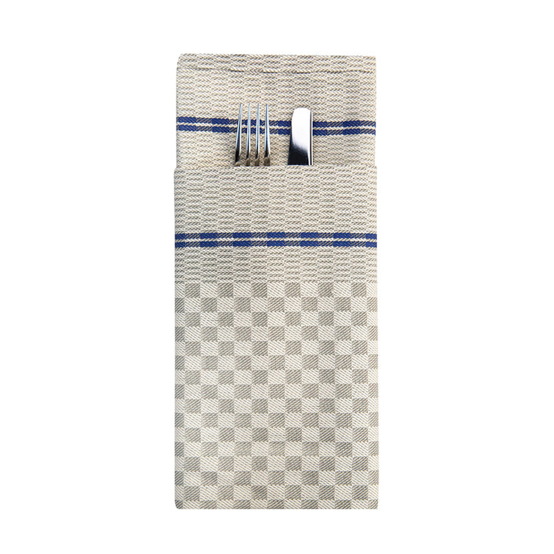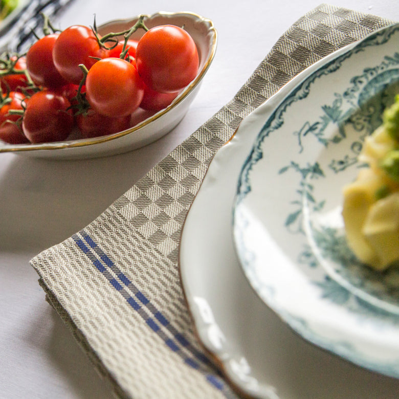 En fin servett med lite rustik, lantlig känsla. Servetten är vackert naturfärgad med ett rutmönster, och finns med röd eller blå rand. Alice är fin både som servett och kökshandduk.