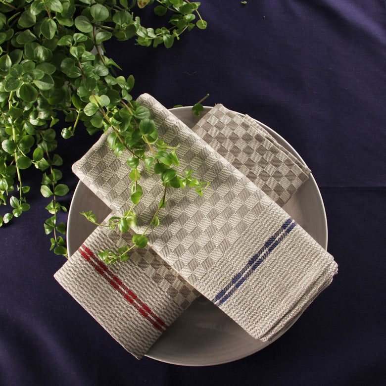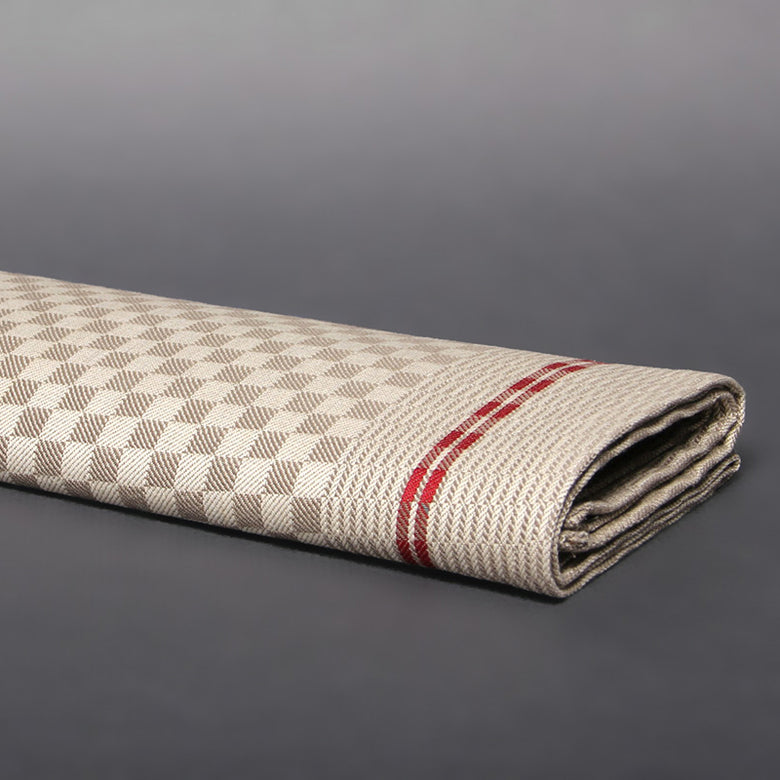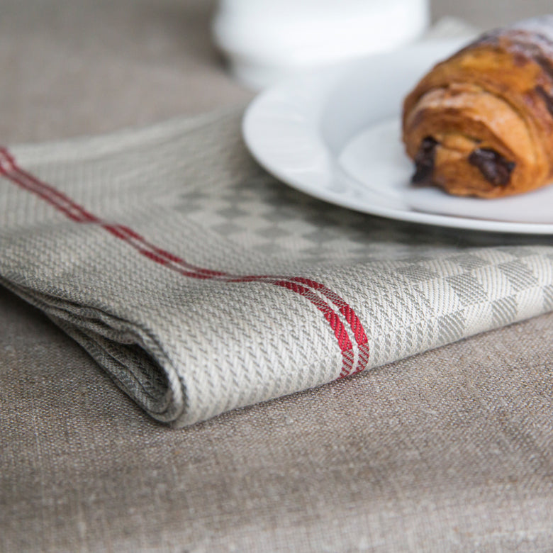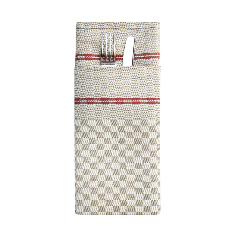 En fin servett med lite rustik, lantlig känsla. Servetten är vackert naturfärgad med ett rutmönster, och finns med röd eller blå rand. Alice är fin både som servett och kökshandduk.