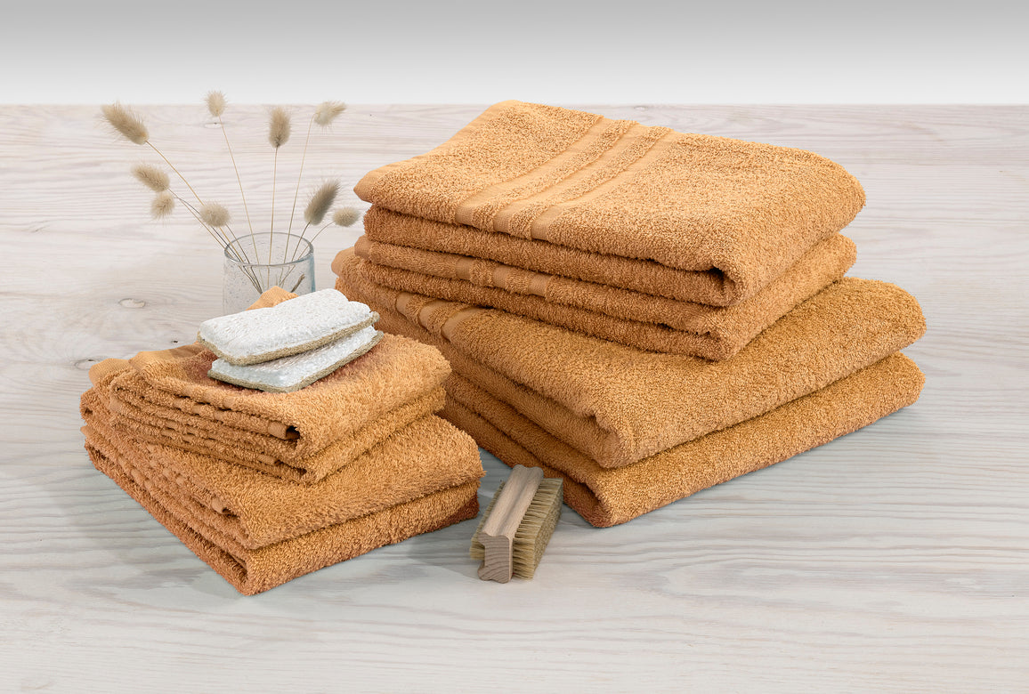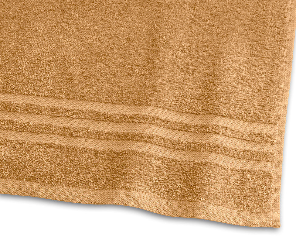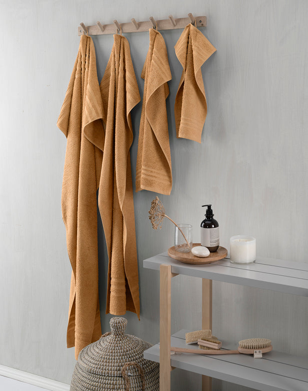 Borganäs Basic frotté är en slät öglefrotté. Handduken har hängare på kortsidorna samt ett klassiskt mönster i form av vävda bårder nedtill. Basic frotté har god absorptionsförmåga och finns i flera olika storlekar, från gästhandduk till badlakan.